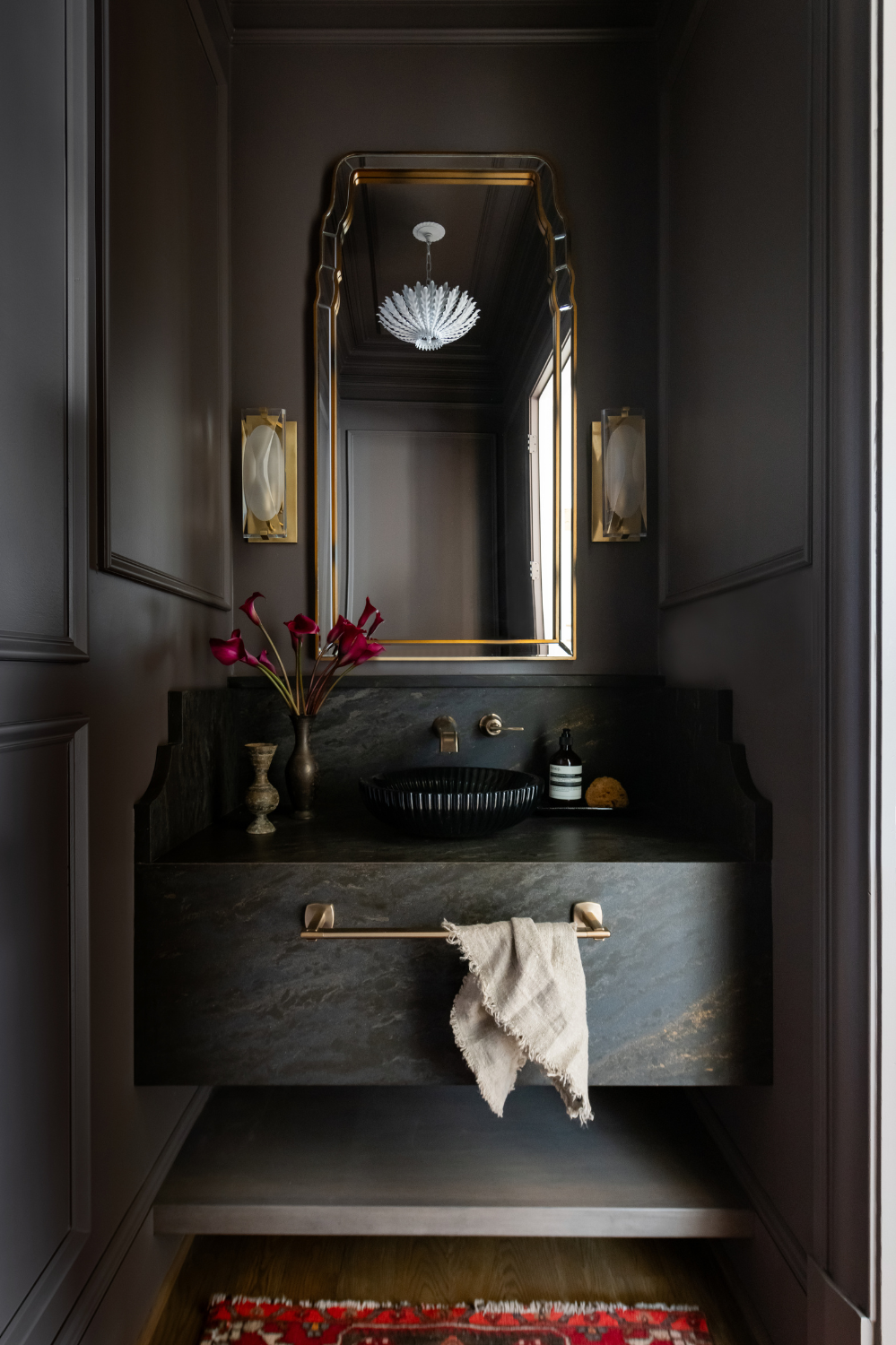 Thoughtful details, such as the integrated towel bar and curated styling elements, further elevate the space without overwhelming it. The combination of rich materials, warm metallic accents, and intentional lighting creates a powder room that feels both sophisticated and inviting.