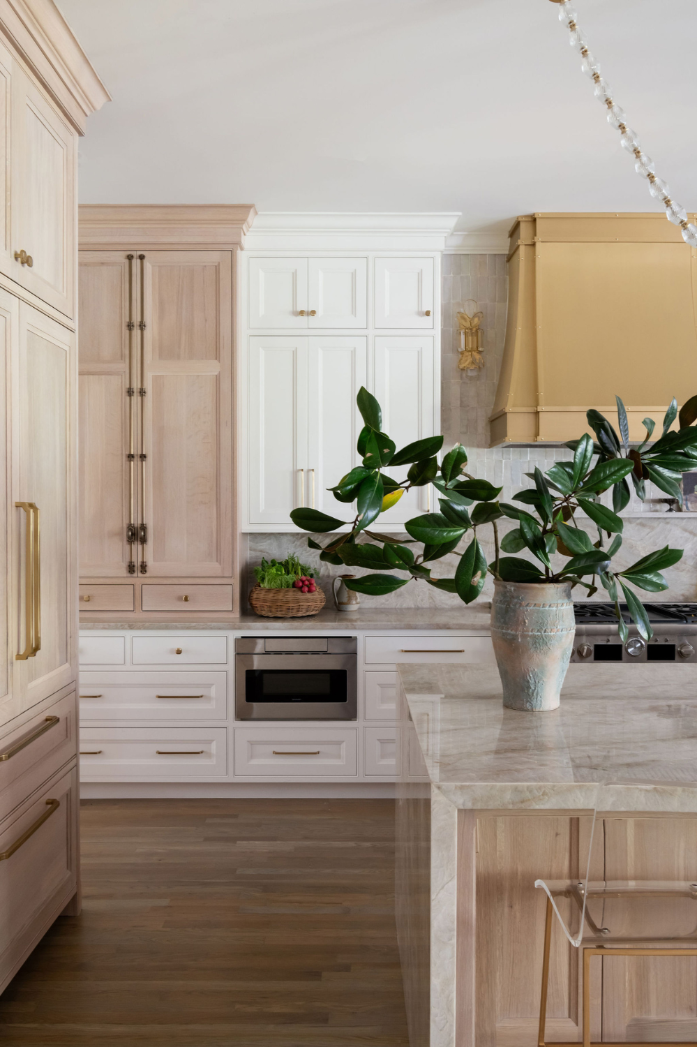 One of the most striking features of the remodel is the custom brass range hood, which creates a dramatic focal point above the cooking area. The warm metallic finish complements the natural wood tones and soft cabinetry colors, bringing depth and character to the space. Brass hardware and fixtures were selected throughout the kitchen to tie the design together and add a layer of sophistication.